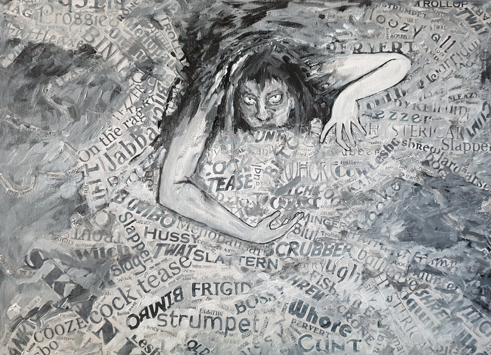 I have made 2 pieces, one all drawn the other including collage made from printed Adjectives such as; FAT, CUNT, SLAG, TWAT, WHORE… need I go on? Yep – SHREW, PIG…. all the names over the years I’ve been called.