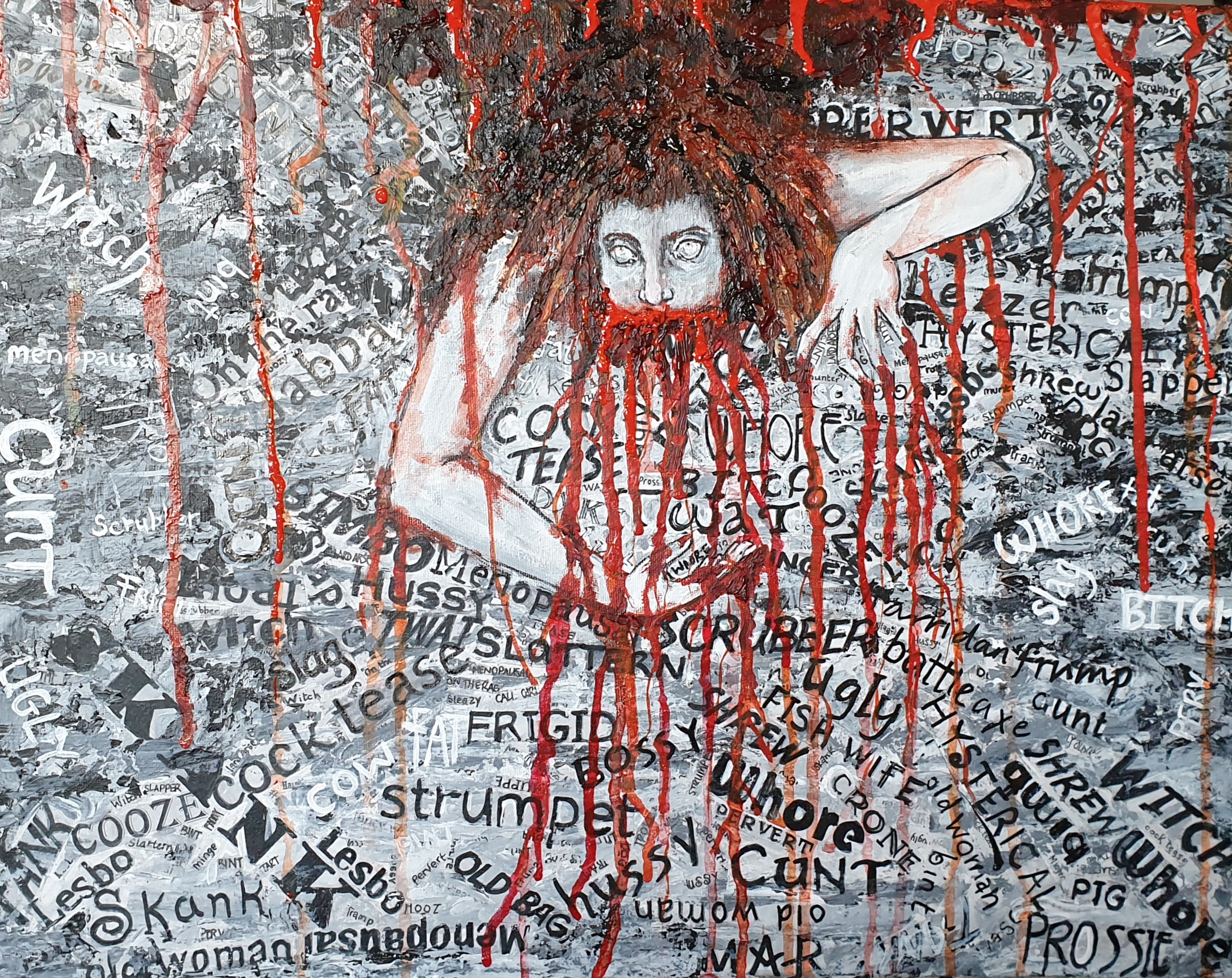 I’ve drawn, then painted in acrylic, myself as a ‘wild woman’ a beastly female, out of control, ripping and tearing the words until they bleed. Swallowing them whole, taking it inside my organs, making them a part of my very being.